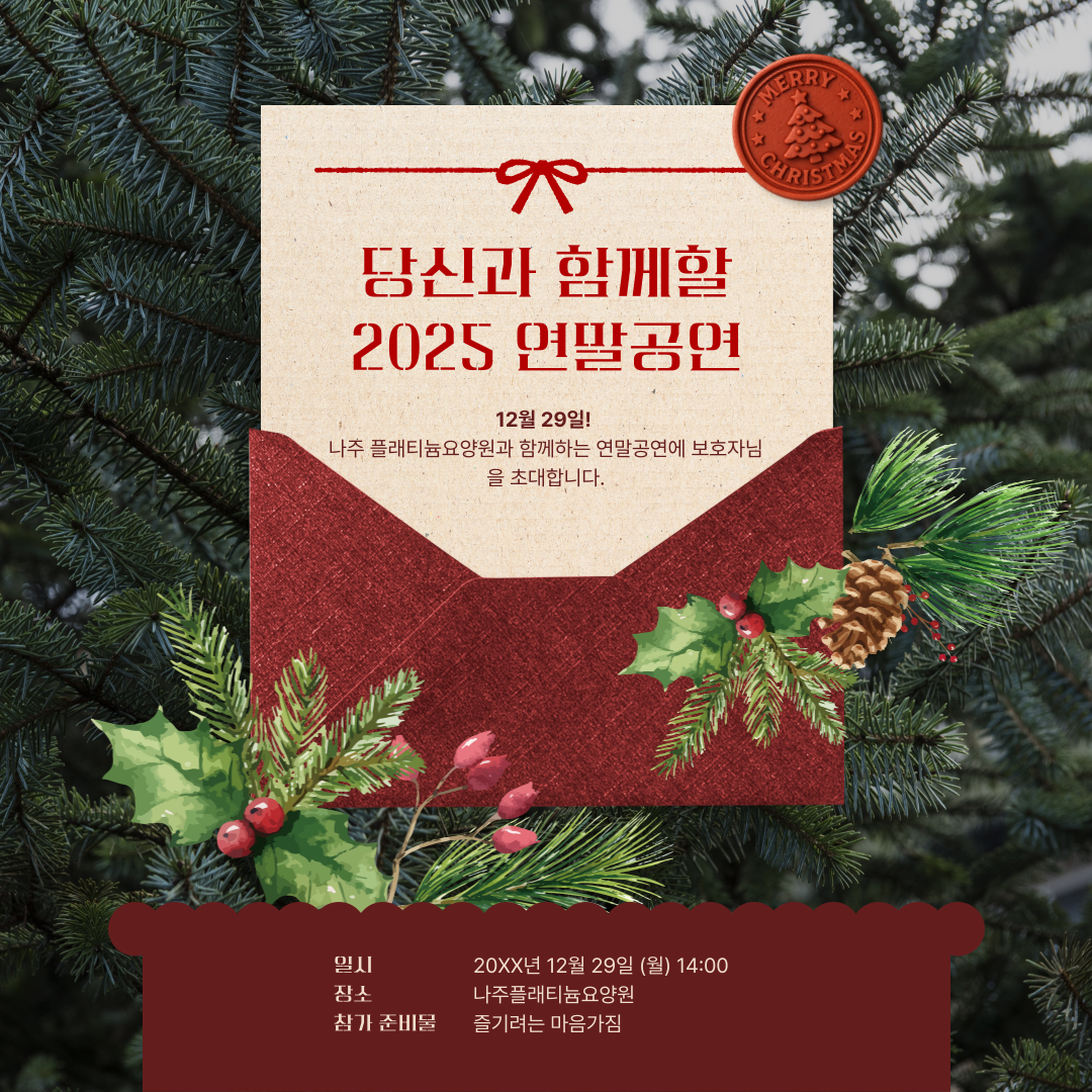 가족과 함께하는 연말 공연에 보호자님을 초대합니다. 관리자 2025-12-19 11:45 2025년 한 해도 정말 수고 많으셨습니다.저희 요양원도 덕분에 2025년 한 해를 잘 마무리할 수 있었습니다. 2025년 12월 29일 오후2시나주 플래티늄 요양원 가족과 함께하는 연말 공연에 보호자님을 초대합니다.시간되시면 어르신들과 함께하시어 자리를 빛내주시면 감사하겠습니다. 첨부파일 제목을-입력해주세요_-001 (17).png 다음글 2026년 1월 식단표 이전글 12월 식단표 목록