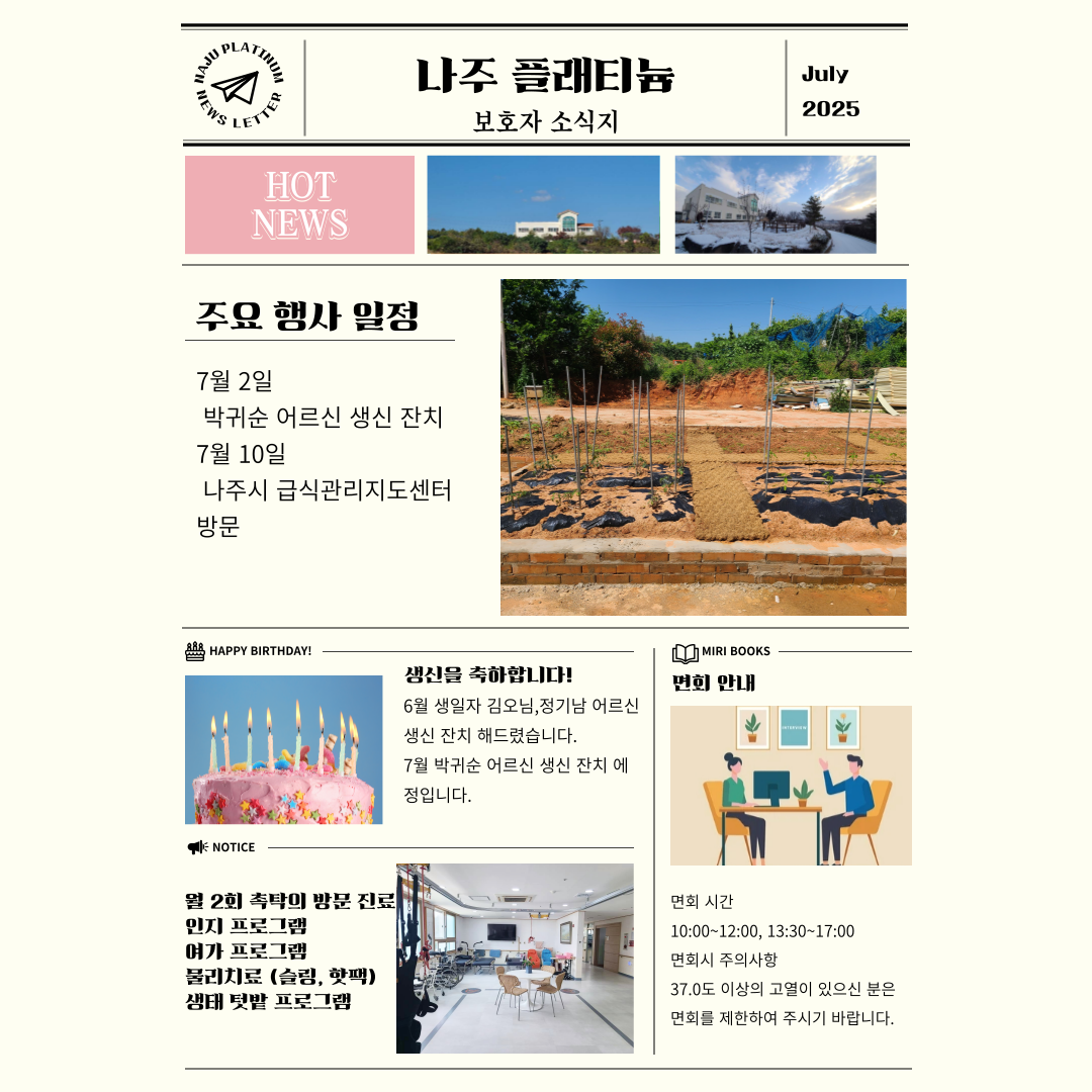 7월 보호자 소식지 관리자 2025-07-02 13:08 7월 보호자 소식지 올립니다. 첨부파일 제목을-입력해주세요__-복사본-001 (1).png 다음글 8월 보호자 소식지 이전글 7월 식단표 올립니다. 목록