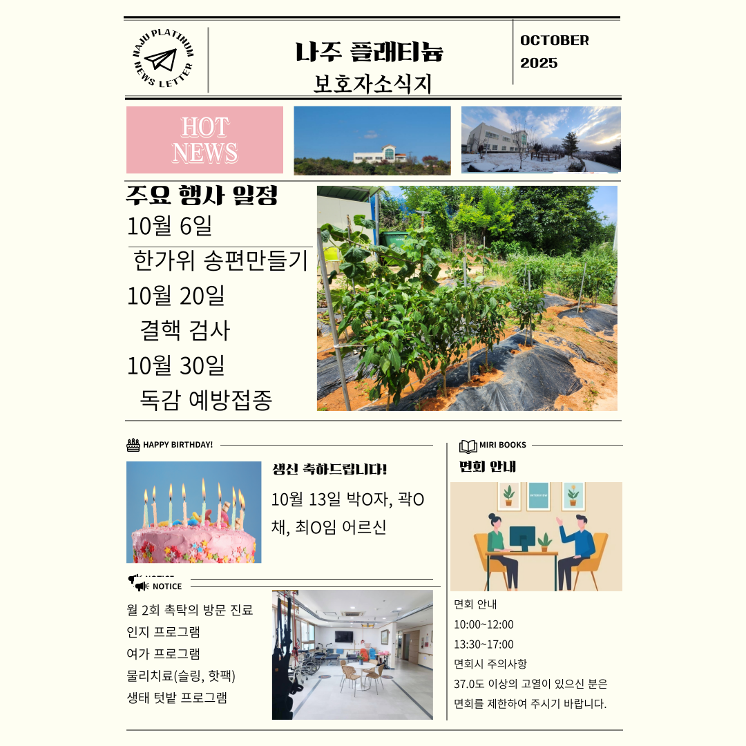 10월 보호자 소식지 관리자 2025-10-24 11:02 2025년 10월 플래티늄 요양원 보호자 소식지입니다. 첨부파일 10월-보호자-소식지-001 (1).png 다음글 11월 프로그램 계획 올려 드립니다. 이전글 9월 보호자 소식지입니다. 목록