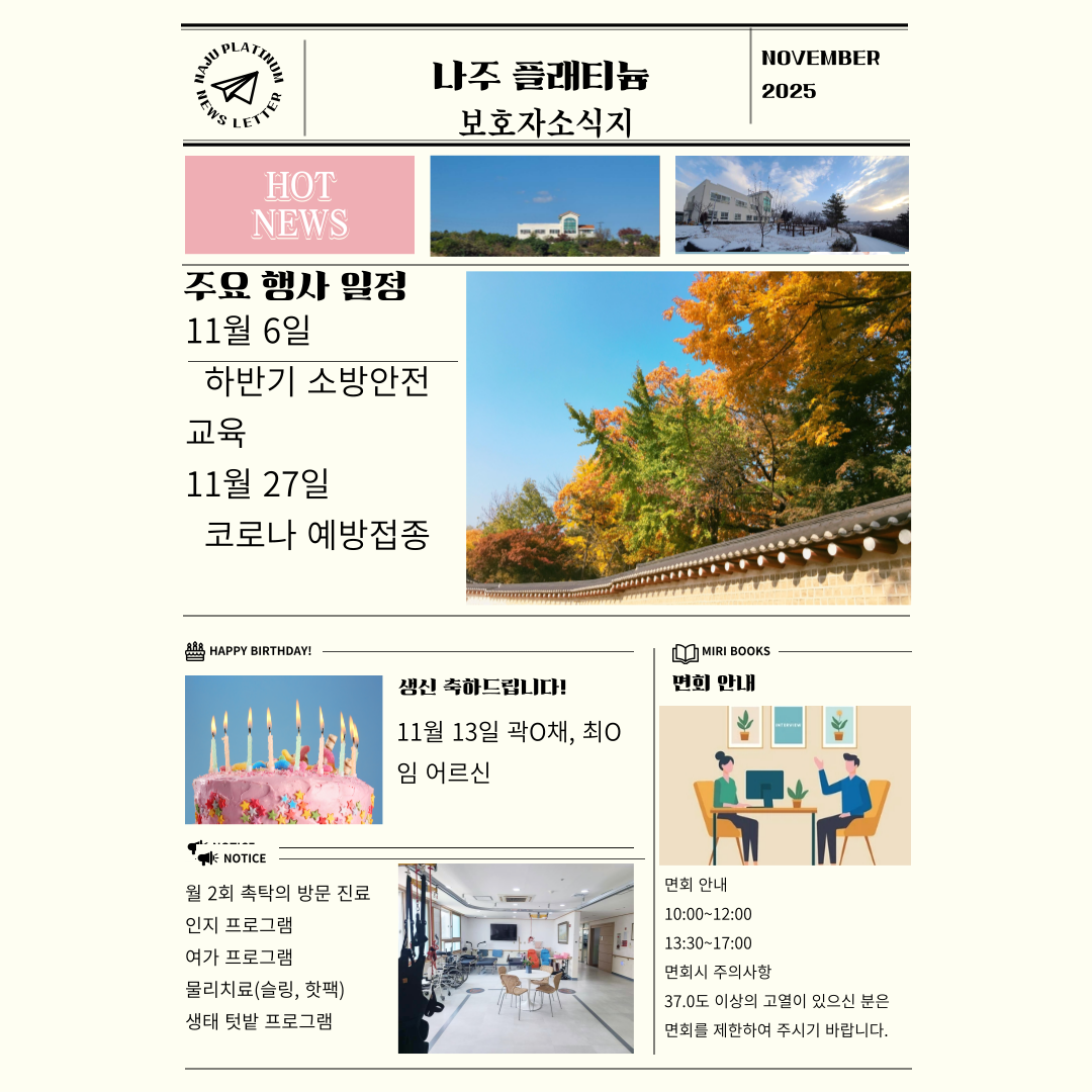 11월 보호자 소식지 관리자 2025-12-01 14:17 11월 보호자 소식지 게시합니다. 첨부파일 11월-소식지-001.png 다음글 12월 프로그램 계획표 이전글 11월 식단표 올려 드립니다. 목록